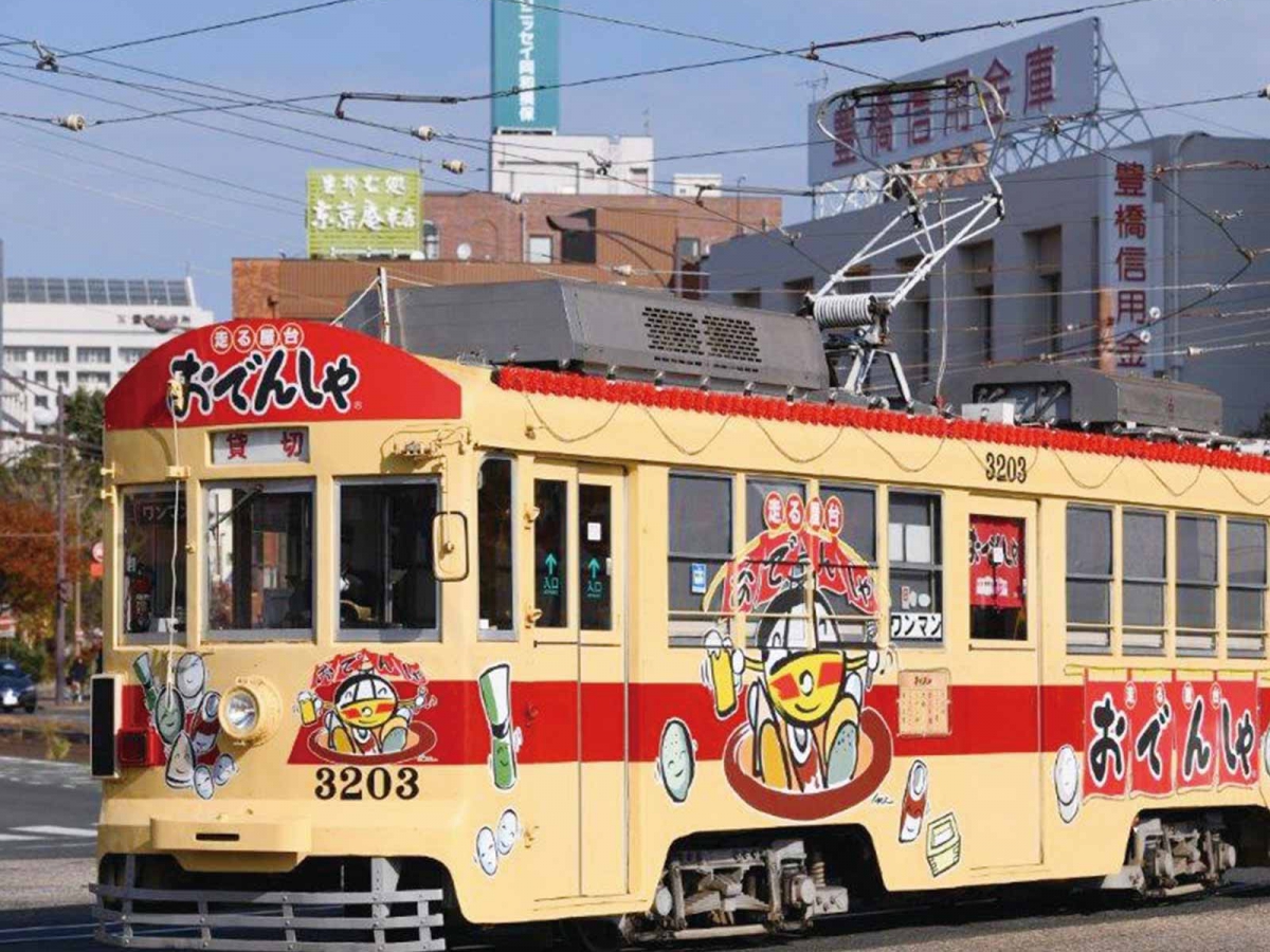 市内電車の車内で“あったかおでん”を召し上がっていただく「おでんしゃ」を毎年11月〜2月“冷たいビール”を召し上がっていただく「納涼ビール電車」を毎年6月〜9月の期間限定で運行しています。市内電車が「アツアツおでんの屋台」や「ビアホール」に大変身、車窓を流れる街並みを眺めながら、おでんをつまみ冷たいビールで乾杯です。