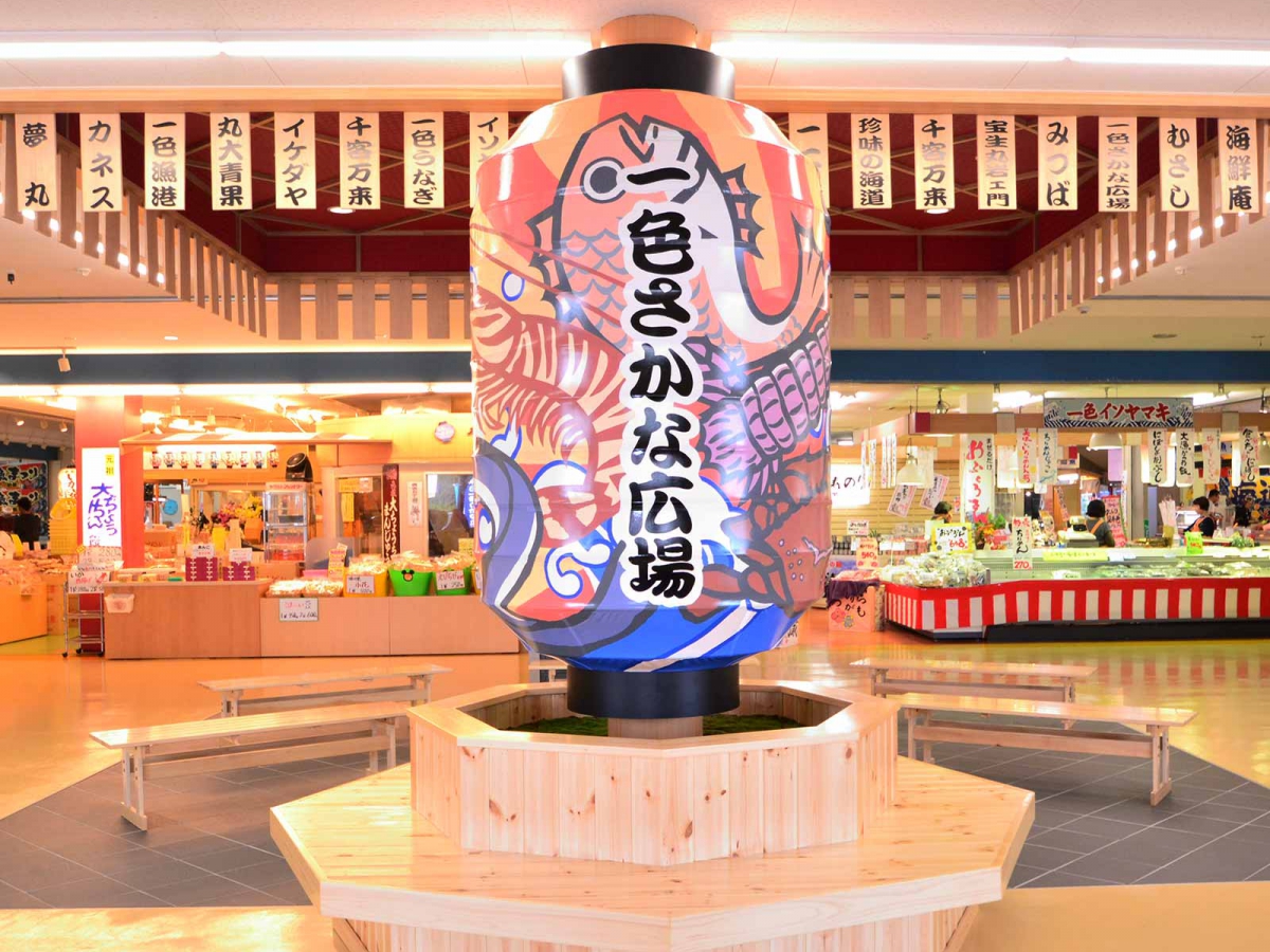 愛知県三大漁港のひとつに数えられる一色漁港で水揚げされた新鮮な魚介類や、海の幸の加工品、地元の農産物・特産品がいっぱいです。その新鮮な魚介類や地元一色産うなぎ、いか・たこの姿焼きなどのおいしいグルメも堪能できます。