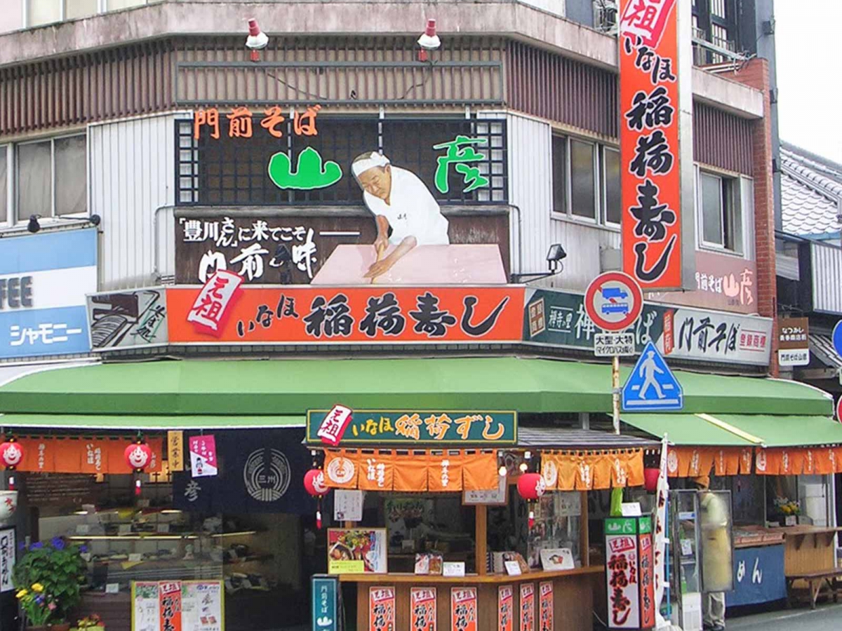 豊川稲荷の古くからの信者の一人が豊川稲荷総門前で創業し創業以来約100年間伝統の味を守り続けています。おすすめは、『いなほ稲荷寿司』です。いなほ(お米)がたくさん採れるに願いを込め、ひじき、人参、椎茸、胡桃、竹の子の5つの具を入れた五目稲荷でご利益入りです。