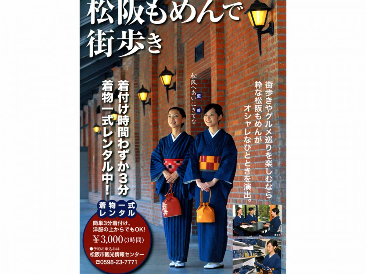 松阪もめんは藍染の色と縞模様が特徴で、かつて江戸で粋な着物として大流行しました。レンタルできる着物は洋服の上から簡単に着ることができますので、着付けに時間がかかりません。なんと3分で着付け可能。女性だけでなく、男性用の着物レンタルもあります。街歩きやグルメ巡りを楽しむなら、粋な松阪もめんがオシャレなひとときを演出します。