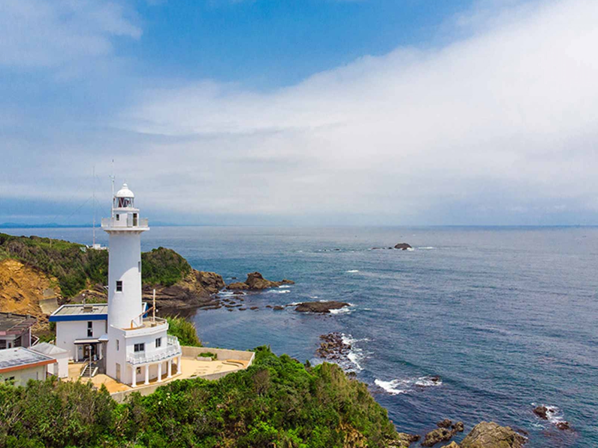 太平洋の荒波が寄せる岸壁の先端に立つ白亜の灯台です。ここの美しい風景は、多くの画家たちにも親しまれ「絵かきの町」として有名です。熊野灘と遠州灘を分ける海の難所、大王埼に建っています。