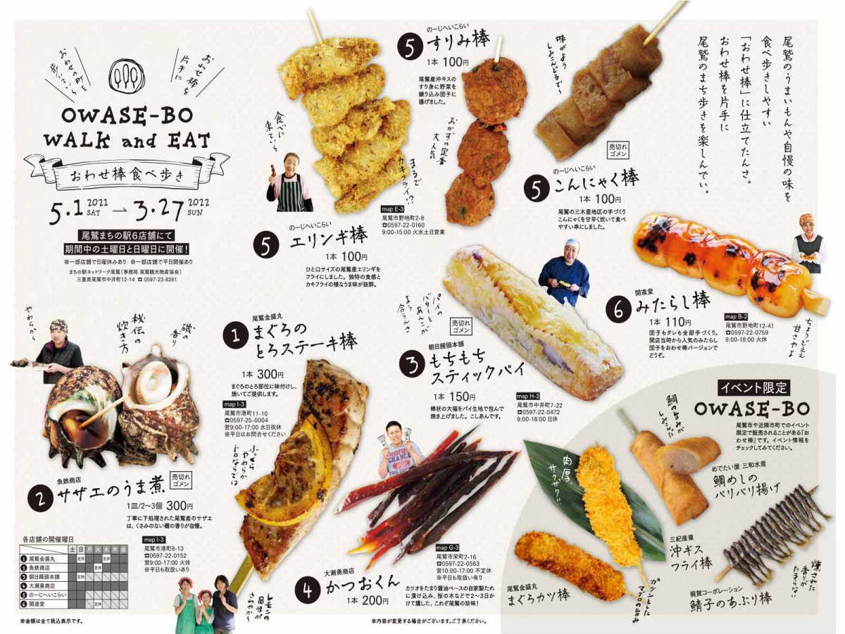 「まちの駅 尾鷲」に登録している店舗は魚屋さん、食べ物屋さんなど色々。どの店も、お立ち寄りいただくと尾鷲の見どころやトイレの場所などを案内してくれます。地図を手に、「おわせ棒」を食べながらまちを巡ることもできます。(定休日にご注意ください)