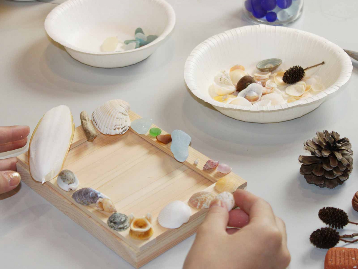尾鷲ひのきのフォトフレームに、貝殻やシーグラスなどを付けたり、バーニングペンで模様や文字を書いて、自分だけの写真たてを作ります。ポストカードも入れられるサイズです。