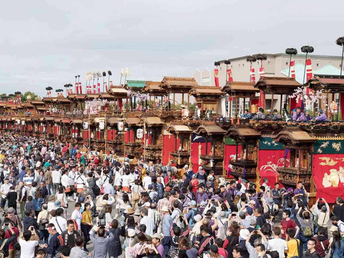 豪奢な彫刻や幕などに装飾された総数31輌もの山車が、勇壮な曳き廻しの後、一堂に会す様子はまさに圧巻で、見るものを魅了します。