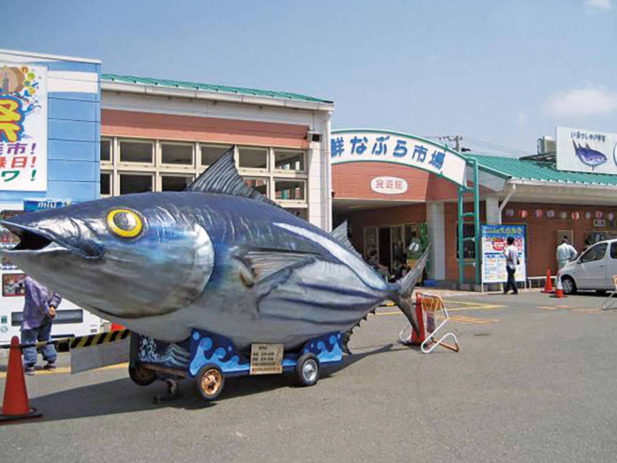 「なぶら」とはカツオの群れのことを指します。活気溢れる市場らしい雰囲気の中、地の魚介類が市価の2〜3割安で手に入ることで多くの観光客で賑わいます。施設は鮮魚や海産物の加工品を扱う6つの店が並ぶ「海遊館」と御前崎港に水揚げされた新鮮な魚介類をメインにした食事が楽しめる「食遊館」の二つに分かれています。